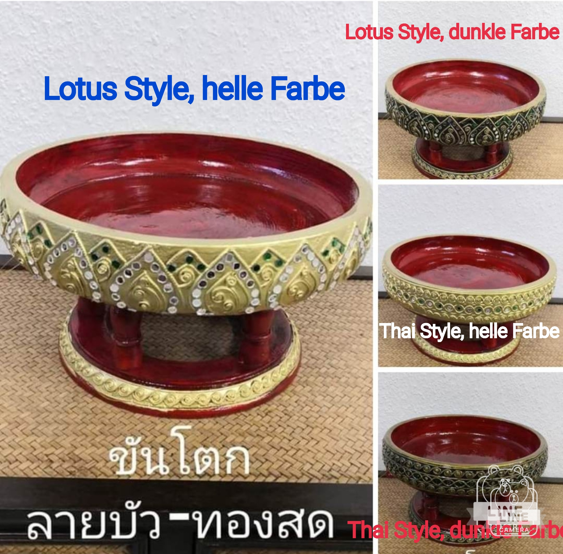 Servierschale-Khan Tok Thai Style Versch.Grösse Dia, 15 cm. 20 cm. 25 cm. und 30 cm. Höhe 15 cm. zwei Versch. Style wie Lotus Blumen Style oder Thai Style mit helle goldener Farbe oder dunkle goldener Farbe, innere der Schale ist rote Farbe.